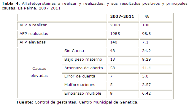 En todo este tiempo analizado existieron 140 pacientes con elevación de la alfafetoproteína en suero materno, representando un 7.1% de positividad. Después de realizada una consulta de evaluación general, que incluye estudio ultrasonogràfico, podemos mencionar como causas fundamentales de su alteración: sin causa aparente (34.2%), el bajo peso materno (9.29%), la amenaza de aborto (41.4 %), el error de cuenta, es decir, realizadas con menos de 15 semanas o con más de 19 semanas de gestación (5 %), el embarazo múltiple (6.42%) y los defectos congénitos (3.57 %), entre ellas, 2 gastroquisis, 1 artrogriposis, 1 oligoamnios severo. (Tabla 4).
