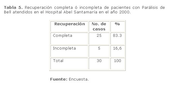 La parálisis de Bell en general tiene un pronóstico favorable por la recuperación total del 85% de los casos.12 En nuestro estudio obtuvimos una recuperación clínica total del 83,3 % lo que confirma lo antes expuesto (tabla 5).