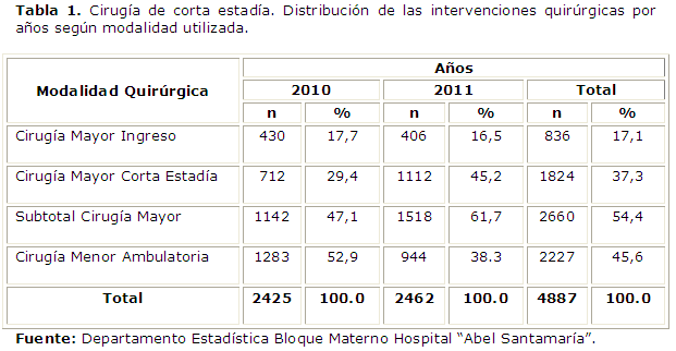 Conclusiones: se comprueba que la cirugía mayor de corta estadía es costo-eficiente y