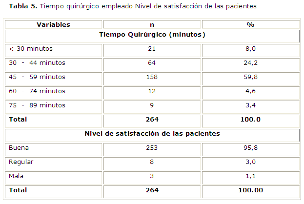 En el propio cuadro se registra el nivel de satisfacción de las pacientes operadas y se aprecia que el 95,8% de las pacientes refirieron que el método fue bueno.
