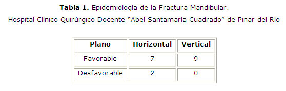 En la tabla 1 se exponen los resultados obtenidos en referencia al grado de desplazamiento de los fragmentos óseos del foco de fractura, encontrándose que de 9 fracturas en cuerpo mandibular sólo 2 de ellas fueron desfavorables en el plano horizontal y las restantes se comportaron de forma favorable; no existieron fracturas desfavorables en el plano vertical.