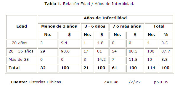 Como es de esperar el mayor porcentaje de mujeres infértiles tienen edades comprendidas entre 20 y 35 años pues es en esta etapa de la vida que generalmente se piensa en la maternidad. En cuanto a los años de infertilidad fue más frecuente la consulta de las parejas con menos de 3 años y 7 años o más de relaciones estables sin lograr concepción precisamente en las edades femeninas entre 20 y 35 años, no encontrándose diferencias significativas en ninguno de los grupos por lo que su distribución fue similar (P<0.05).