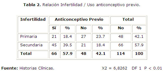 La tabla 2 muestra el tipo de infertilidad y su relación con la utilización de anticonceptivos, encontrándose una alta incidencia de infertilidad secundaria cuando se usó anticonceptivo previo, demostrándose una dependencia de estas variables.