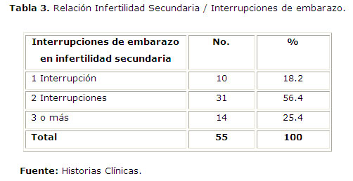 La tabla 3 relaciona la infertilidad secundaria con el antecedente de interrupciones de embarazo observándose que el 56,4% de las pacientes se había realizado dos interrupciones previas, y el 25,4% tres o más interrupciones de embarazo.