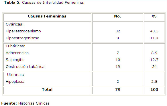 La tabla 5 relaciona las causas femeninas de infertilidad, observándose que incidió más el hiperestrogenismo(40,5%)seguido de la obstrucción tubárica(24%) y la salpingitis(12,7%)