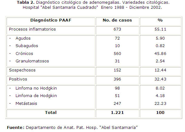 Se tomaron todas las punciones aspirativas con aguja fina (PAAF) de ganglios linfáticos durante 15 años de trabajo y se compararon con los resultados histológicos, en un estudio prospectivo longitudinal, descriptivo en 1221 pacientes, obteniéndose una evaluación del método con una especificidad de un 97,97% y una eficacia de un 94,51%, se comprobó que a medida que se envejece aumenta la posibilidad de enfermar por una neoplasia maligna. En los pacientes diagnosticados como negativos la patología más frecuente fue la adenitis crónica con 560 pacientes y en los casos diagnosticados como positivos las metástasis fueron las más frecuentes con 247 enfermos, seguidas por los linfomas no Hodgkin y Hodgkin. Se calcularon los costos unitarios tanto del acto quirúrgico para la extracción de la muestra como del procesamiento del tejido una vez obtenido, determinando un ahorro total de $37,240.06 en los casos en que el diagnóstico pudo ser concluido sólo mediante la PAAF, sin necesidad de la realización de biopsia por parafina.