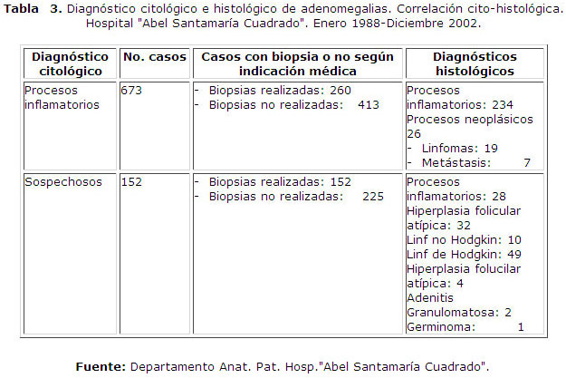 Como observamos en la tabla 3, la correlación en las citologías negativas fue alta (96,13%), ya que de 673 casos hubo un total de 26 (3,86%) falsos negativos que correspondieron con 19 linfomas y 7 procesos metastáticos. A los 152 casos diagnosticados como sospechosos les fue realizada biopsia, 92 (60,52%) presentaron procesos malignos siendo el mayor diagnóstico el de linfoma no Hodgkin con 54 casos.