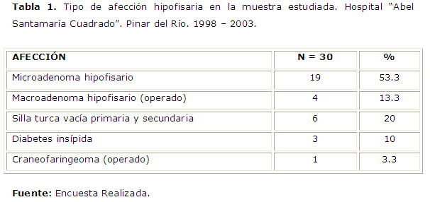 En la tabla 1 apreciamos la frecuencia de las distintas afecciones hipofisarias; del total de pacientes estudiadas (N =30), observamos que el microadenoma de hipófisis es la disfunción más frecuente, representada en 16 pacientes del total (53,3%), seguido en orden de frecuencia por el síndrome de silla turca vacía, ya sea primario o secundario, el macroadenoma operado, la diabetes insípida y el craneofaingeoma operado fueron las menos frecuentes.