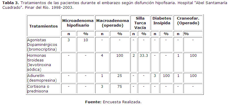 En la tabla 3 se muestran los tratamientos de las pacientes durante el embarazo, según el tipo de disfunción hipofisaria. Observamos que sólo 3 pacientes con diagnóstico de microadenoma hipofisario usaron agonistas dopaminérgicos. Las pacientes con macroadenoma operado usaban tratamiento sustitutivo con hormonas tiroideas y corticosteroides. El 100% de las pacientes con diabetes insípida usaban el Adiuretín (desmopresina) por vía nasal.