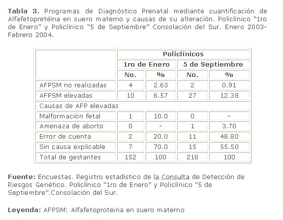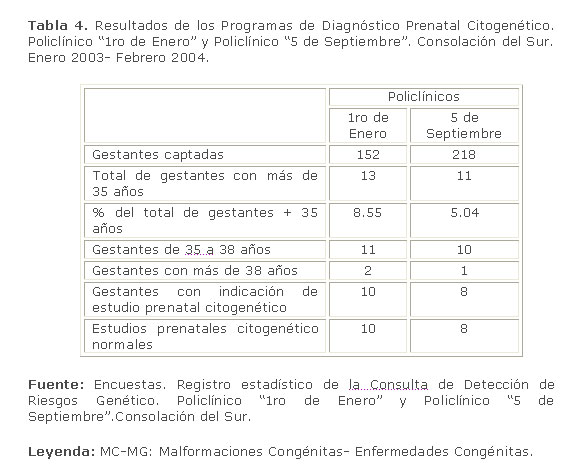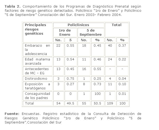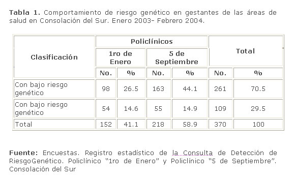 Durante todo estos años, el Programa de Genètica ha costribuido en gran medida a la reducción de las tasas de mortalidad infantil y los indicadores de morbilidad y calidad de vida en la comunidad, los protagonistas principales el médico y la enfermera de la familia juegan un papel de extraordinario valor por lo que se realizó un estudio descriptivo, prospectivo, de corte logitudinal que abarcó el total de las gestantes desde el 1 de enero de 2003 hasta el 29 de febrero de 2004, en ambos policlínicos del municipio Consolación de Sur. Se utilizaron datos de las consultas de genéticas y se aplicó una encuesta a las gestantes objeto de estudio. Asistieron a consulta de Deteción de Riesgo Genéteico Comunitario las 370 gestantes estudiadas(100%), clasificándose con riesgos genéticos incrementado 109 gestantes(29,5%). Los principales factores de riesgo genéticos identificados fueron el embarazo en la adolescencia, los antecedentes familiares de malformación congénita y enfermedades genéticas y la edad materna avanzada. Se realizaron 18 diagnósticos prenatales citogenéticos resultando todos normales. Mediante el ultrasonido bidimencional se diagnosticaron en el policlínico 1ro de Enero, 3 malformaciones (2 renales y 1cardiovascular). En todos los casos la pareja solicitó interrupción terapéutica del embarazo después del asesoramiento genético y el diagnóstico fue comprobado por Anatomía Patológica. Se comprobó la relación entre los valores bajos Alfafetoproteína y el bajo peso al nacer.