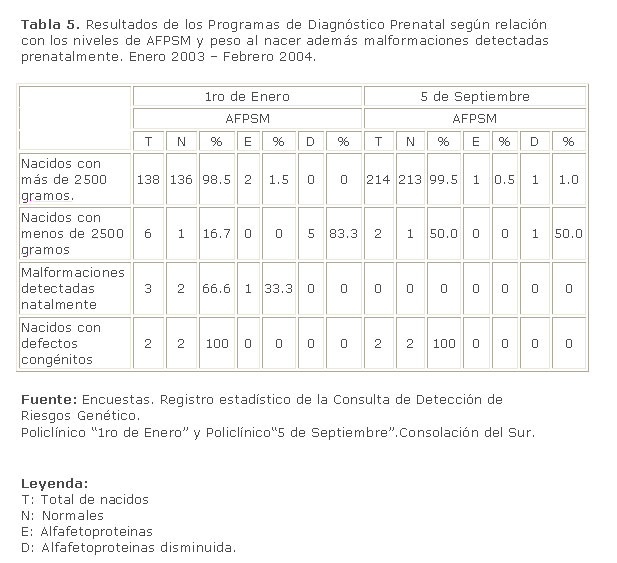 Tabla 5 , Se refleja en su análisis la relación entre los valores de AFPSM disminuida y el bajo peso al nacer coincidiendo con estudios realizados en nuestro país por Hernández Rojas.30 Al ser el Alfafetoproteína un predictor del bienestar fetal valdría la pena tener en cuenta este elemento por parte de todos los médicos y enfermeras de la atención primaria, pues la gestante con alteración de los niveles de AFPSM deben tener una vigilancia más especializada ante la probablidad de aparición de problemas fetales, con el bajo peso y con esta afirmación estamos sugiriendo que no sea vista la AFPSM solamante como un parámetro para detectar malformaciones fetales y que su evaluación sea unicamente patrimonio de los genétista.