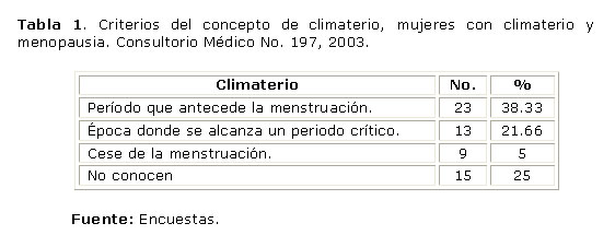En la tabla 1 se observan los criterios sobre el concepto de climaterio obteniéndose que 23 (38.33%) conocía que lo que significaba climaterio, pero sin embargo este mismo por ciento no corresponde con el criterio de que es una etapa donde se alcanza un período crítico (21.66%); además que el 15 % no conocía nada del tema.