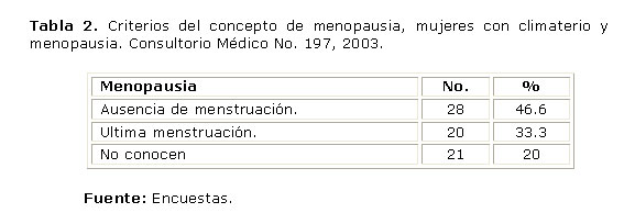 La tabla 2 ofrece criterios sobre de menopausia comprobando que 28 mujeres (46.6%) señala a la menopausia como la ausencia de la menstruación y el 20% no conocía el término.