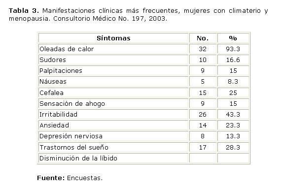 Nowadays it is known menopause is a physiological condition of another natural change in women, it is a stage of chronic deficiency which can last even 20 years, that was why a longitudinal and descriptive research on the topic was carried out. Out of 113 women a sample composed by women between the ages 45 and 55 (67.8 %) was analyzed. All women belonged to Doctor's Office (No. 197) at Hermanos Cruz Outpatient Clinic in Pinar del Río Municipality during the months of January - July 2003. To achieve the purposes the necessary report was developed and a survey was conducted where the variables assessed were: concepts of climacteric and menopause, clinical manifestations presented, sources of information, among others. Data were processed following a percentage analysis and recorded in arithmetical charts. Sexual intercourse was mainly affected due to the decrease of libido; sources of information were mass media (radio and television) nurse and doctors, the majority of patients considered necessary to publicize the topic and others. At the end of the survey a series of recommendations was offered to women with the aim or turning this stage more pleasant and tolerable.