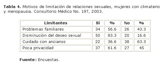Tabla 4. Motivos de limitación de relaciones sexuales, mujeres con climaterio y menopausia. Consultorio Médico No. 197, 2003.