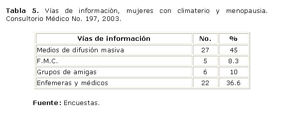 La tabla 5 nos ofrece las vías por las que se obtuvo la información, siendo los medios de difusión masiva (45 %) y las enfermeras y médicos (36.6%), no siendo de la misma manera la Federación de Mujeres Cubanas (8.3%) teniendo este tema de gran importancia para ser tratado en las reuniones que agrupan a dichas mujeres.