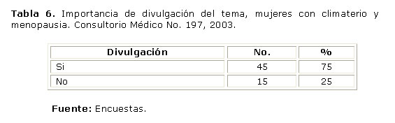 En la tabla 6 se observa la importancia de la divulgación del tema observándose que 45 mujeres (75 %) opinó que es importante su divulgación para de esta manera ampliar sus conocimientos y como consecuencia mejorar los estilos de vida de las mujeres con climaterio y menopausia.