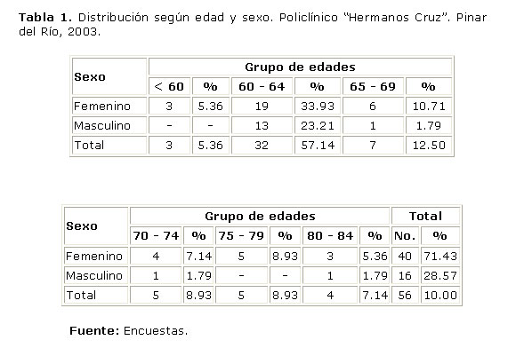 En la tabla 1 se observa que de los 56 ancianos encuestados, 40 pertenecen al sexo femenino (71.42 %), con predominio del grupo etáreo de 60 a 64 años (32 ancianos, 51.14 %).