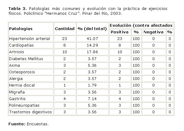 En la tabla 3 aparece una relación de las enfermedades más frecuentes en estos ancianos y su evolución con la práctica de estos ejercicios. Se puede observar que 10 de ellos (17.85 %) padecen de artrosis y 23 (41.07 %) padecen de hipertensión, mientras que la totalidad de ellos han mejorado su condición de salud con el desarrollo de la actividad física.
