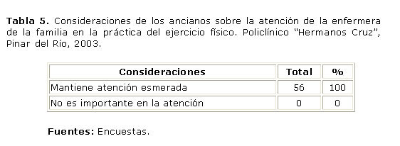 Por último, la tabla 5 presenta las consideraciones que poseen los ancianos acerca de la atención de Enfermería en la práctica de los ejercicios. El 100 % de los encuestados comparte en criterio de que la enfermera mantiene una atención esmerada y que su ayuda y apoyo es de gran importancia para el desarrollo exitosos de la actividad.