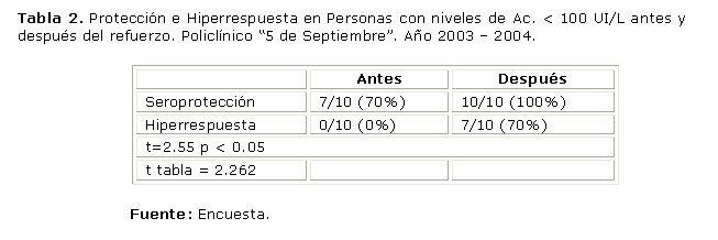 En ambas muestras sexológicas (La tomada antes de la dosis de refuerzo y pasado 1 mes de la misma), se realizó la determinación cuantitativa de anticuerpos contra el Antígeno de Superficie del V.H.B. mediante método Inmunoenzimático desarrollado en el Instituto Superior de Ciencias Médicas de la Habana.33 Considerándose seroprotegidas aquellas personas cuyos sueros tuviesen > 10 UI/L e hiperrespondedores cuando estos valores fuesen > 100 UI/L e hiperrespondedores cuando estos valores fuesen > 100 UI/L.