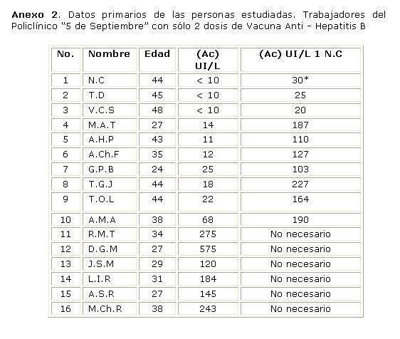 Se efectuó la entrevista con 41 trabajadores de la Salud del Policlínico Comunitario "5 de Septiembre" de un total de 127, donde se tomaron los siguientes datos: edad, área de trabajo y esquema de vacunación de la Hepatitis B en cuanto a números de dosis. Previo consentimiento escrito, los trabajadores objeto de estudio, fueron incluídos en el mismo. Posteriormente se extrajo sangre de la vena ante-cubital para estudiar la respuesta inmune, aplicándose, una dosis de refuerzo de 20 microgramos de la vacuna Heberbiovac HB, Lote 59117, en los que tuviesen irregularidad en el esquema de vacunación (sólo dos dosis) y valores d3e anticuerpos < 100 UI/L. Se administró una tercera dosis (refuerzo) por vía intramuscular en el deltoide realizándose una extracción de sangre 30 días después de administrada la misma.