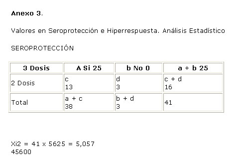 En aquellos trabajadores que si habían cumplido el esquema de inmunización se observaron niveles de seroprotección e Hiperrespuesta de 100% y 80% respectivamente, valores estos que coinciden con el meta análisis de resultados obtenidos con nuestra vacuna en 30 trabajos realizados en países de los 4 Continentes Mayores (36, 37, 38, 39, 40 y 41) por lo que el comportamiento del personal vacunado y el lote de vacuna empleado no difiere de lo esperado.
