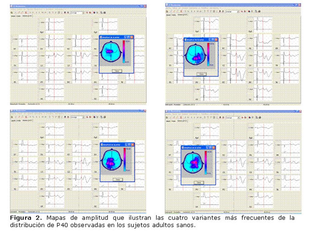 La figura 2 ilustra las principales variantes de máxima amplitud de P40 a través de mapas de amplitud de los sujetos sanos que conformaron la muestra. Nótese como existieron diferentes patrones de máxima amplitud, no así de distribución, pues en todos los sujetos siempre estuvo el P40 en las regiones centro-parietal en línea media e ipsilateral.