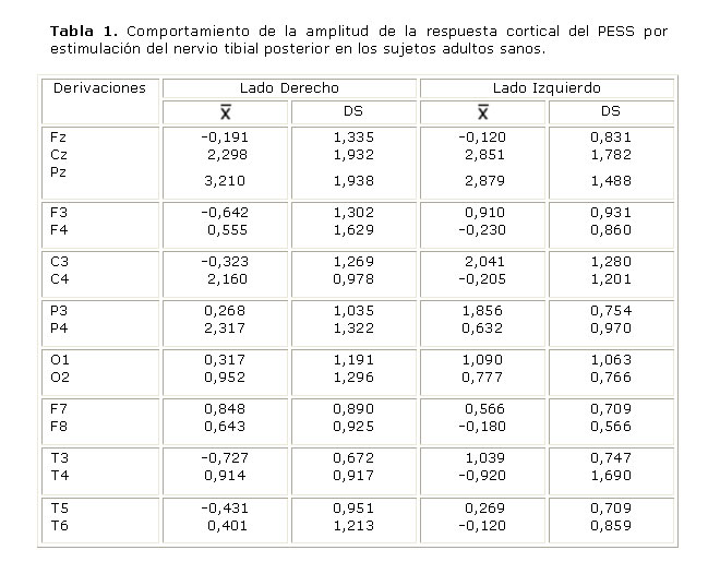 La tabla 1 muestra los valores de amplitud (media y desviación estándar) de las respuestas corticales del PESS por estimulación del nervio tibial posterior para ambos lados en los sujetos sanos estudiados. Nótese que las mayores amplitudes correspondieron con las derivaciones Cz, Pz, C4-P4 (al estimular el lado derecho) y C3-P3 (al estimular el lado izquierdo), tal como destaca la inspección visual de los registros individuales (ver figura 2).