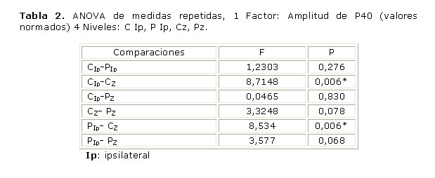 Para responder a esta interrogante se realizó un ANOVA de medidas repetidas con un factor (amplitud de P40) con 4 niveles (regiones: central ipsilateral, parietal ipsilateral, Cz y Pz), cuyo resultado global resultó estadísticamente significativo (F 4,0228, p 0,0099). Los resultados de las diferentes comparaciones se resumen en la tabla 2 donde se puede observar que existieron diferencias estadísticamente significativas entre las regiones centro-parietal, ipsilateral y línea media. A partir de tales diferencias estadísticamente significativas, si se observan los valores de la tabla 1 se puede ver que estas diferencias pueden estar atribuidas a mayores amplitudes en las regiones centro-parietal e ipsilateral, si se comparan con los valores de línea media.