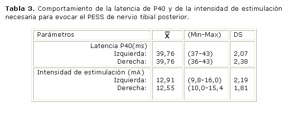 Por último, la tabla 3 resume el comportamiento de los valores de media y desviación estándar de la latencia del pico P40 y de la intensidad de estimulación que fue necesario utilizar en los sujetos sanos estudiados para evocar el PESS del nervio tibial.