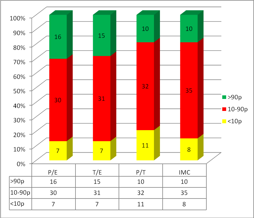 En el caso del peso/edad y la talla/edad el 13,2% de los valores era menor del 10p, mientras que el 30,2% y el 28,4% se ubicaron por encima del 90p en estos indicadores respectivamente. En lo que respecta al peso/talla, el 20,7% de los valores estaba por debajo del percentil 10 y el 18,9 % se encontraba por encima del percentil 90 y respecto al IMC/edad, estas cifras fueron del 15,1% y también del 18,9 % respectivamente.