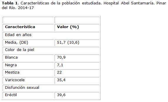 La edad media fue de 51,7 años. El blanco fue el color de la piel predominante, 70,9 % de los pacientes. El varicocele fue diagnosticado en el 35,4 % y la DSE en el 39,6 % de los pacientes respectivamente (tabla 1).