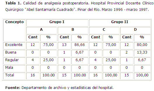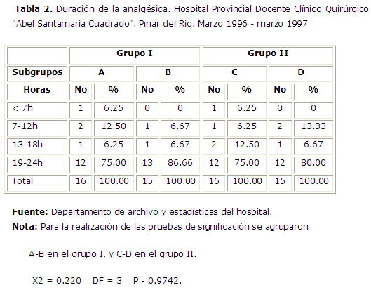 La mayor cantidad de casos obtuvieron alivio del dolor entre las 19 y 24 h. (tabla 2) y ninguno a los que se le calculo la dosis de morfina a 0.1 mg/kg, tuvieron dolor antes de las 7 h, siendo estos los que arrojaron un mayor porciento de analgesia postoperatoria excelente. Agrupando los subgrupos A, B y C; no se demostraron diferencias significativas en cuanto a duración y calidad analgésica (p = 0.9742).