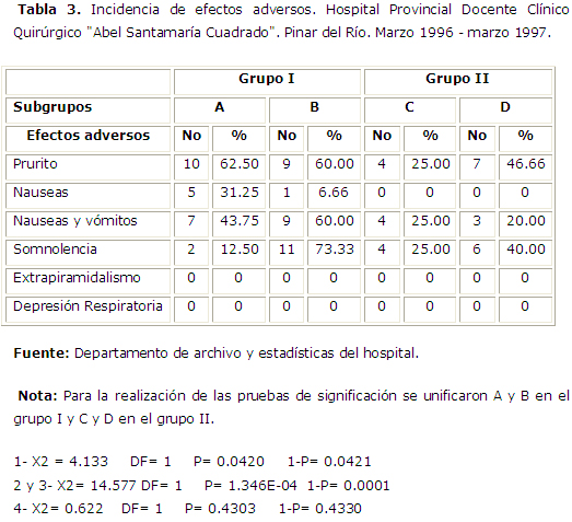 La tabla 3 muestra la incidencia de efectos adversos. No se presentaron nauseas aisladas en los subgrupos C - D y el prurito fue menor en estas pacientes, lo que demuestra diferencias significativas (p = 0.0420).