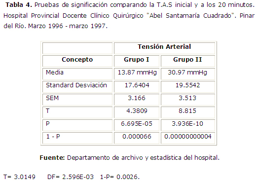 Al aplicar el Test de Student (tabla 4) a las variaciones de la TAS, se observo que en el grupo II, la disminución fue significativa (p=2.596E-03) en relación a las pacientes del grupo I, sin reportar ninguna complicación por este efecto.