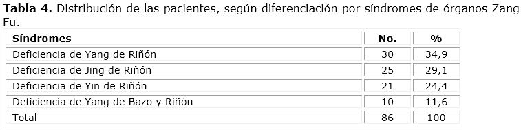 El análisis de las características de la lengua y el pulso asociada a los síntomas y signos predominantes en los pacientes, y demás datos recogidos en la historia clínica tradicional, mostró en la diferenciación de los síndromes según órganos Zang Fu, un predominio de la deficiencia de Yang de Riñón en el 34,9 %, seguido deficiencia de Jing de Riñón (29,1 %) y deficiencia de Yin de Riñón (24,4 %). (Tabla 4)
