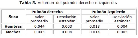 No se observan diferencias significativas en relación al volumen de los pulmones derecho e izquierdo, enambos sexos (tabla 5).