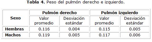 El peso del pulmón derecho e izquierdo, muestra diferencias significativas en ambos sexos (tabla 4).
