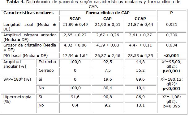 Al analizar las variables sociodemográficas (tabla 3) y características oculares (tabla 4), en relación a la forma clínica del CAP, se encontró que los factores que lo determinan son: la edad (p<0,001), la amplitud del ángulo camerular (p<0,001), las sinequias anteriores periféricas (p<0,001) y la PIO (p<0,001).