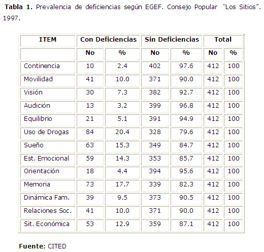 En la tabla 1 se muestra la prevalencia de deficiencias según EGEF, encontrándose que en la esfera biomédica el ítems que acumuló mayor número de deficiencias fue el uso de drogas, en 84 individuos, para un 20,4%, seguido por la movilidad en 41 ancianos, 10,0% y en tercer lugar los trastornos de la visión con un 7,3%. En la esfera psicológica la mayor afectación corresponde a la memoria, que alcanzó un 17,7% seguido por los trastornos del sueño (15,3%) y las alteraciones del estado emocional (14,3%). La afectación social mas relevante fue la situación económica adversa presente en el 12,9%.
