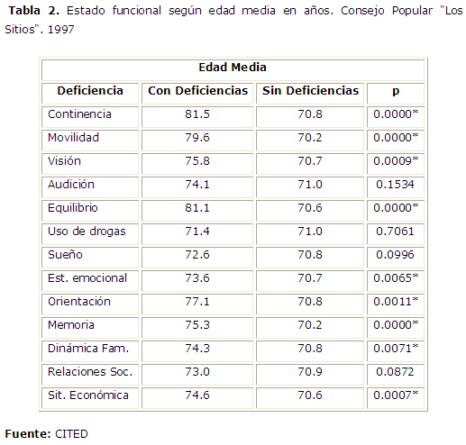 En la tabla 2, (Estado funcional según la edad media en años) se observa que los ancianos con alteraciones en los ítems de la esfera biomédica fueron significativamente mas viejos, que los que no estaban afectados lo cual concuerda con lo reportado por la literatura revisada.4, 12,16, 27 Las alteraciones de la audición, aunque tuvieron mayor prevalencia, en los individuos de mayor edad, la diferencia no resulto significativa. Estos resultados no coinciden con los de otros informes. 4, 12, 18, 19 En el uso de drogas no se encontraron diferencias significativas.