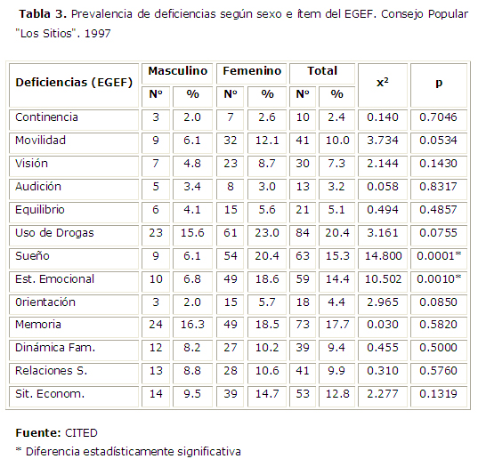 La tabla 3 que presenta la frecuencia de deficiencias, según el sexo y los ítems del EGEF, muestra que el nivel de prevalencia para el sexo femenino fue superior en todos los ítems, con excepción de la audición. A pesar de esto no hubo diferencias estadísticamente significativas, nada mas que para el sueño y el estado emocional.