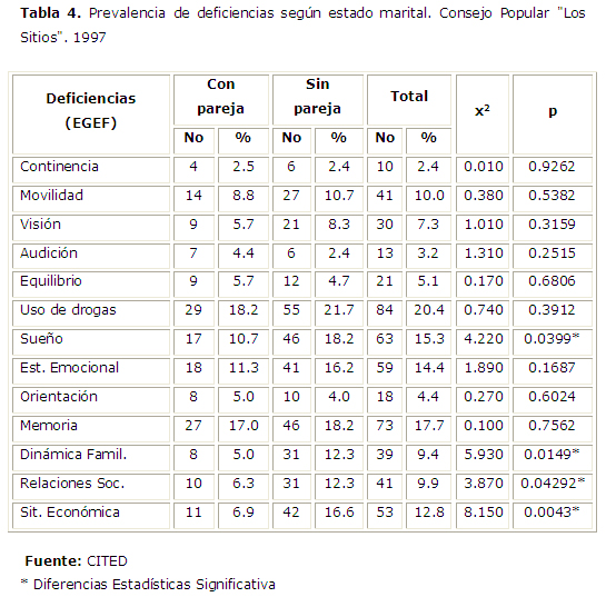 En relación al estado marital de los ancianos y la prevalencia de deficiencias (tabla 4) se pudo comprobar que hubo un aumento en la frecuencia de las mismas en los individuos sin parejas para los ítems que miden movilidad, visión, uso de drogas, sueño, estado emocional, memoria, y para todos los ítems de la esfera social; aunque estas deficiencias solo presentaron diferencias estadísticamente significativas para los ítems que miden afectaciones del sueño, y para los de la esfera social.