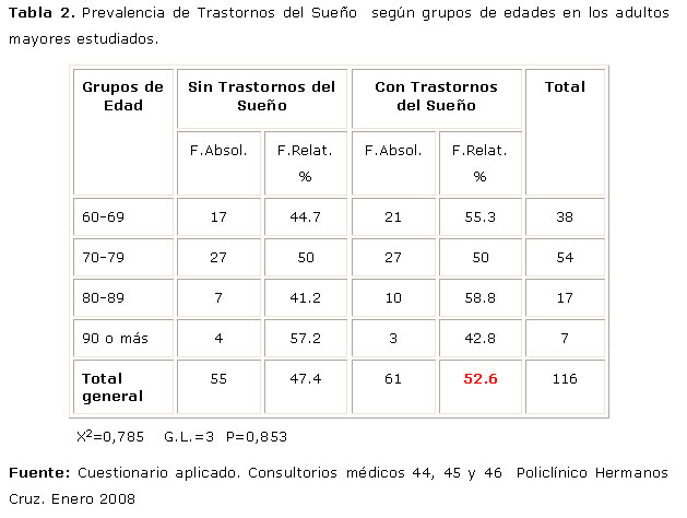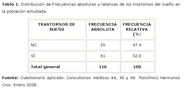 A continuación en la tabla 1 se muestran la frecuencia absoluta y relativa de aparición de trastornos de sueño en la población estudiada. Obsérvese que el 52.6 % de los ancianos encuestados presenta trastornos del sueño.