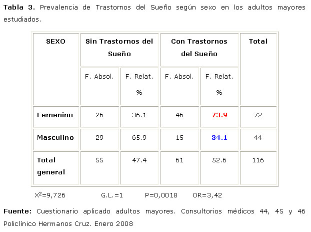 En la tabla 3 se indica la prevalencia de Trastornos del Sueño según sexos en los adultos mayores estudiados.