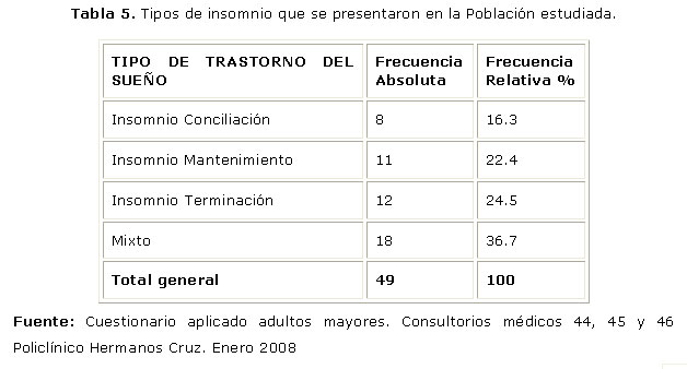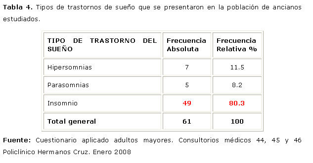 Las tablas 4 y tabla 5 muestran los tipos de trastornos del sueño que fueron encontrados en la población anciana observándose que de ellos el insomnio representó el de mayor frecuencia de aparición con un 80.3 %.