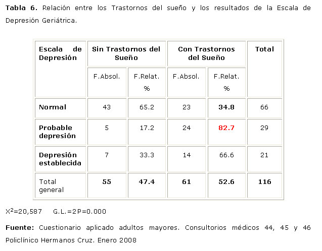 Se ve una asociación significativa (p= 0.000) entre la depresión y la presencia de Trastornos del sueño y la mayor asociación se produce en aquellos que tienen una probable depresión de los cuales el 82.7 % presenta algún trastorno del sueño, también los ancianos con depresión establecida en un 66.6 % los presentaron.