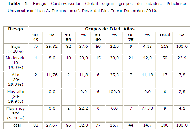 El riesgo cardiovascular global (RCG) desde moderado a alto se fue incrementando a medida que aumentaron las edades, observándose que el 100% de los pacientes con riesgo muy alto tenían entre 60-69 años de edad, igualmente el 77.8% de los que presentaron riesgo cardiovascular muy muy alto tenían entre 70-79 años no ubicándose en ambas categorías de riesgo pacientes entre los 40 y los 49 años. En las categorías de riesgo moderado y alto se observó que en la medida que avanzaba la edad crecía la frecuencia de pacientes ubicados en éstas. Tabla 1.