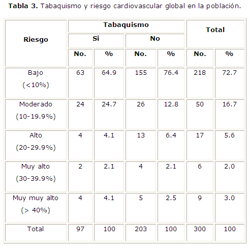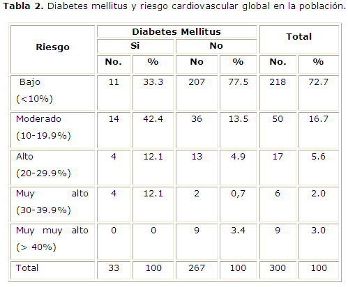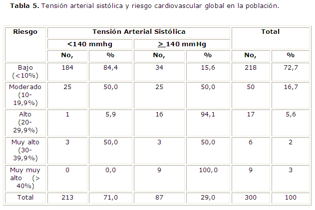 Material and Method: descriptive and cross-sectional study. Target group: all patients from 40 to 75 years old of the health area and the sample comprised 300 people chosen by poly-phases or complex sampling. Variables: demography, toxic habits, systolic blood pressure, weight, size, glycemia and total cholesterol. Absolute and relative frequency was calculated determining global cardiovascular risk of each subject using the risk-qualifier from World Health Organization.